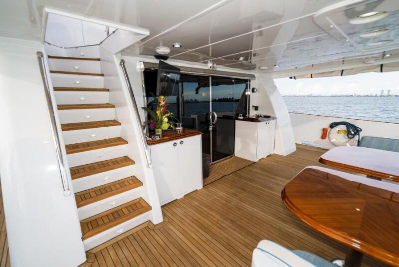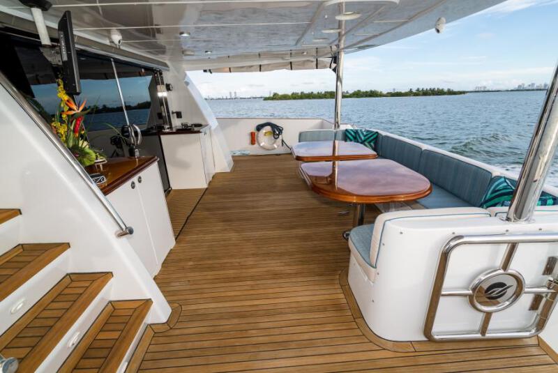 Always one of the most poplar spots to gather onboard, the deck layout was designed as a great spot for dining or lounging. There is New Flat screen Tv, and flanking either side of the Stainless Steel Sliding glass doors are two storage cabinets with wood counter tops, a sink, fridge, and ice maker.