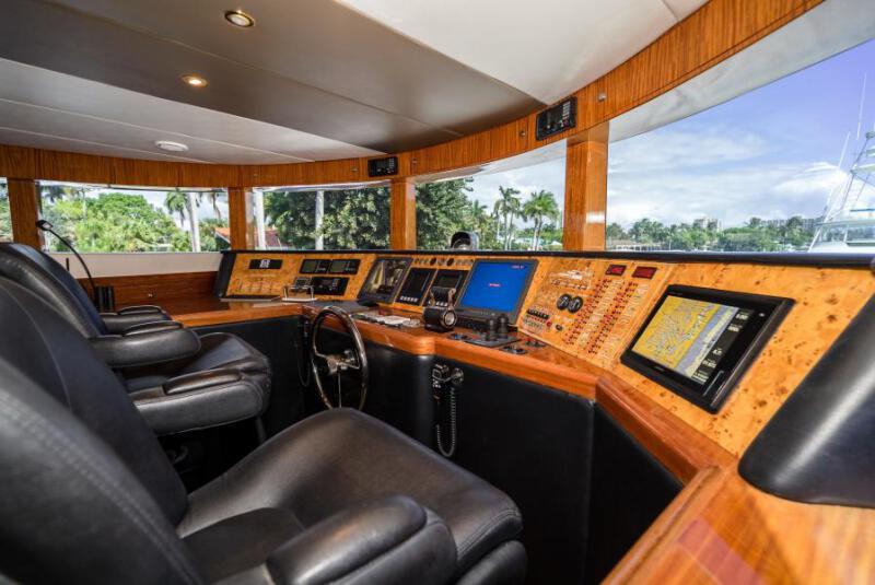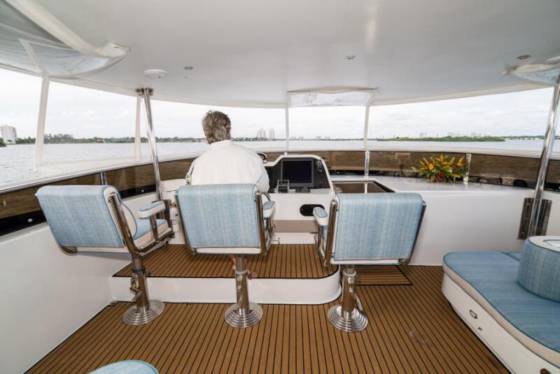 Expansive and Partially Enclosed Flybridge with Hard Top Shading; New Windshield, New Isinglass, (New) Fully Equipped Sit-Down Wet Bar and Stainless Steel Barbecues, Soft Teak Carpeting