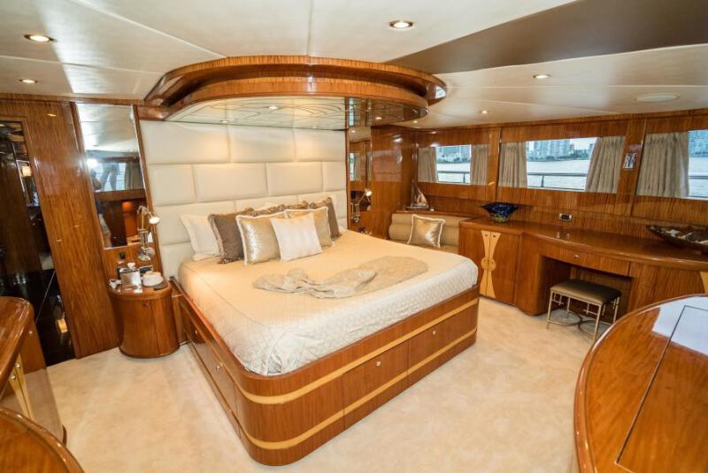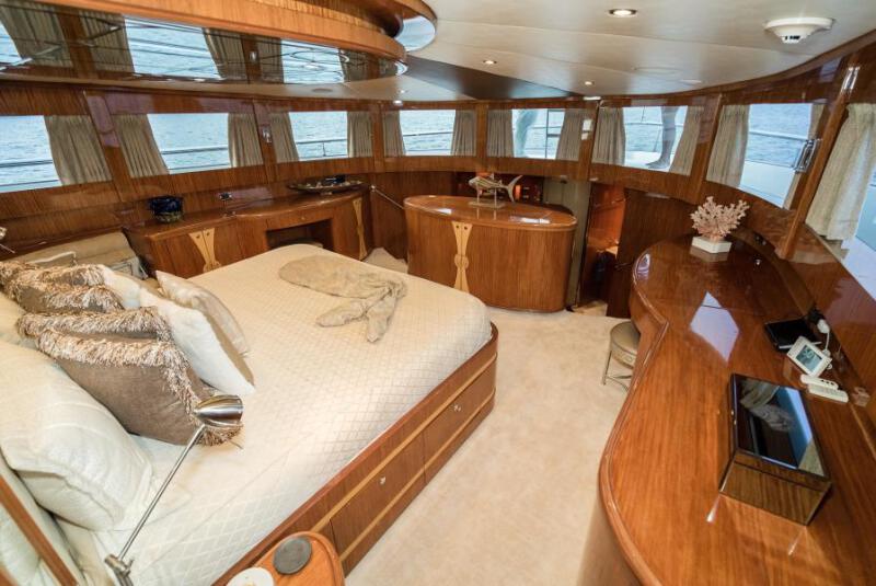 Illusion has a master stateroom that s a designer s work of art as it takes up the whole forward section of the motor yacht s main deck from starboard to port. Not only is the master stateroom large, it also boasts a 270 degree panoramic view on port, bow and starboard sides to be viewed by a push of a button for the automated drapes to open and take in the magnificent surrounding vistas.