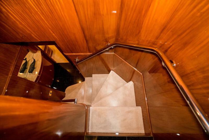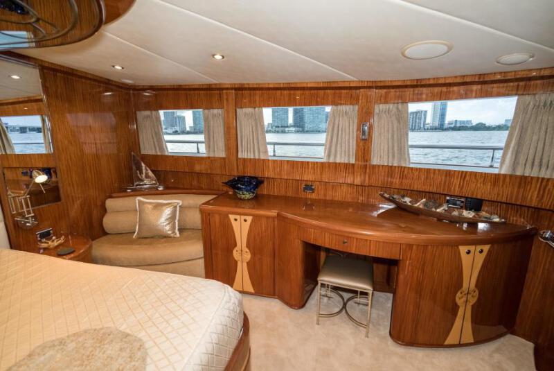 The master also offers a "42 high definition smart TV( 2019) that rises out of the dresser in front of its oversized king with all new soft goods 2019. Everything is operated from a touch screen keypad inclusive of surround sound audio which can be switched on by another press of the button on your tablet to play your favorite Pandora station, Sirius satellite radio or perhaps you desire streaming your recorded music from your smartphone or iPad via the yacht s onboard Bluetooth connection. The master suite also supplies a hidden in-wall safe, cedar lined walk in closets, illuminated makeup table, settee bench, desk and a bed with a custom full height white leather headboard with intricate leather ceiling appliqu . The master bedroom leads down two short, curved stairways to an Italian marble luxury bathroom with custom design that boasts his and hers custom sinks and vanities, flanking a large all glass radius shower with a bench. The master bath also houses a separate privacy toilet, and custom lockable closet holds a refrigerator, and coffee maker .