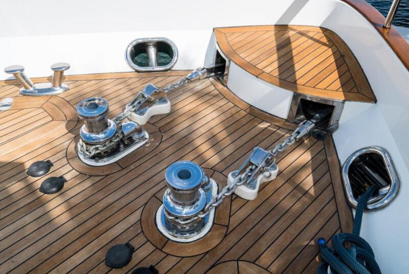 There are two stainless gates that protect guests from the accessing teak stairways to the swim platform. There is a molded fiberglass stairway with teak steps to the fly bridge and forward access to the bow is easy with covered walk around side decks. Warping winches at the aft cleats make line handling at the dock easier.