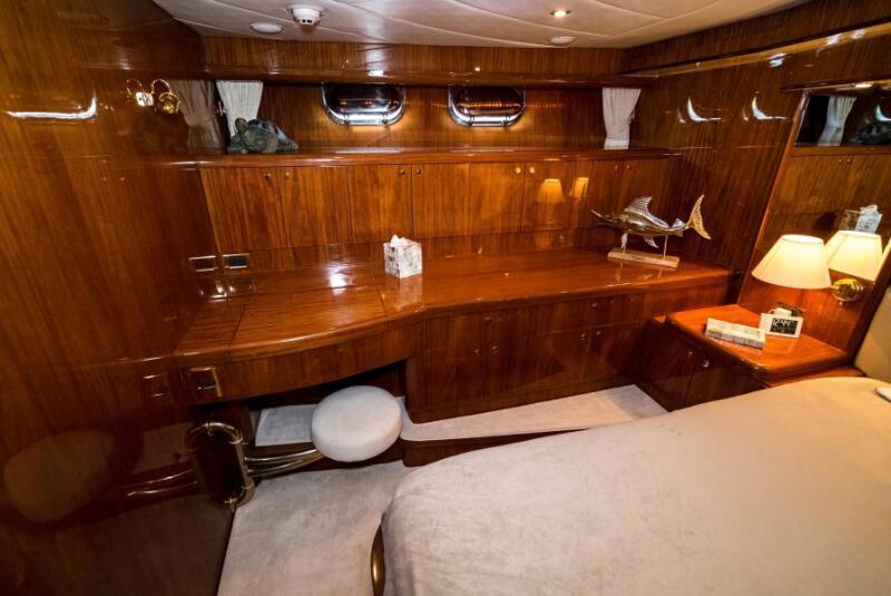VIP Stateroom: (Second master) This is a Full Beam VIP stateroom with a king-sized walk-around berth centerline, built in couch to starboard, sit-down vanity, plenty of storage with hanging locker, built in wine cooler in cabinet. This stateroom is the size of most master staterooms on comparable yachts.