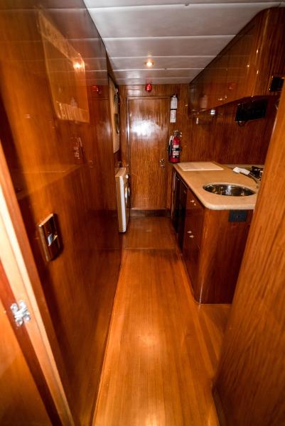 Walking forward thru the salon on the starboard side, you will come into a foyer with granite flooring to port is a day head with a granite counter top sink. Walking forward of the day head, past the raised pilothouse and the stairs to the lower deck, is the entrance to the on-deck master.