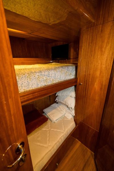 Two cabins; one for captain with double-size berth and private full head. The Second crew room has two bunks . Each room has their own head and shower.