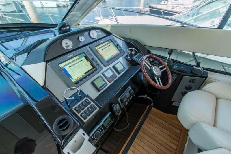 The Sole flatscreen TV is built into the cherry cabinetry and has the ability to mirror the Raymarine chart plotters. There is also a Raymarine remote built into the sofa that is great to use for planning the next day's trip.